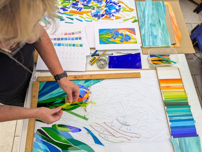 430 at the latest count. The pieces are all different, all with different colours, transparencies and degrees of brilliance. I have a working palette of about 90 colours, and I’ll likely use up to 50 in any one piece.